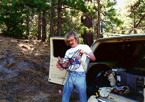 Alan Walter deploys a REFTEK instrument at the Seal Beach Weapons station. An external GPS, a REFTEK, and a battery are evident. The buried cable and seismometer lie to the right of his feet. Nuclear weapons are stored in the bunker behind him.