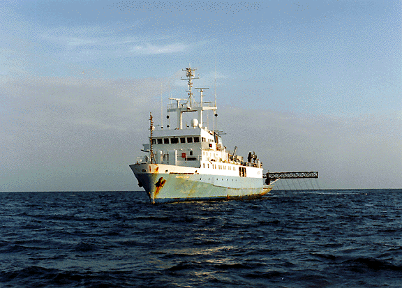 A view of the R/V Ewing showing the 8000+ cubic inch airgun sources mounted on the back of the ship. Individual airgun busts from these sources could be seen at stations 200 km away.